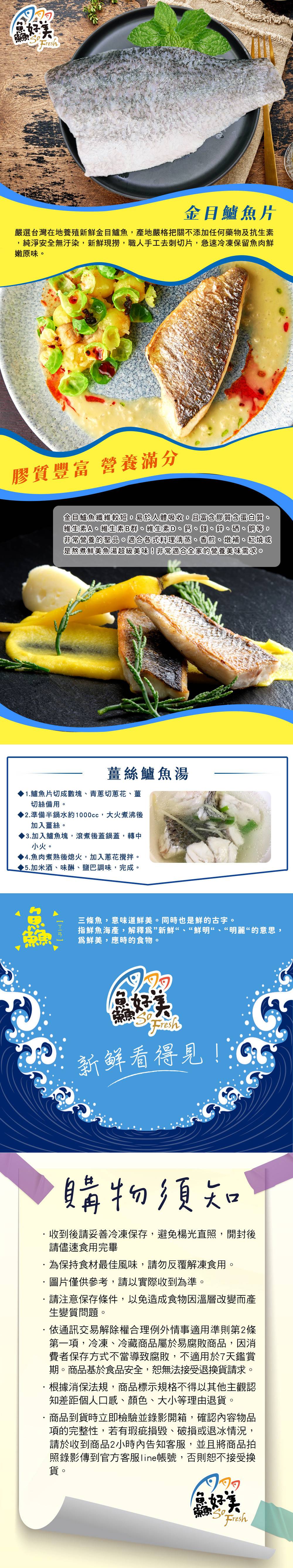 商品詳情 金目鱸魚片150-200g/包產品重量:150-200g/包商品產地:台灣保存方式:冷凍-18℃保存期限:冷凍24個月(保存期限二分之一以上之有效期限) 金目鱸魚片150-200g/包 TWD $170 TWD $85